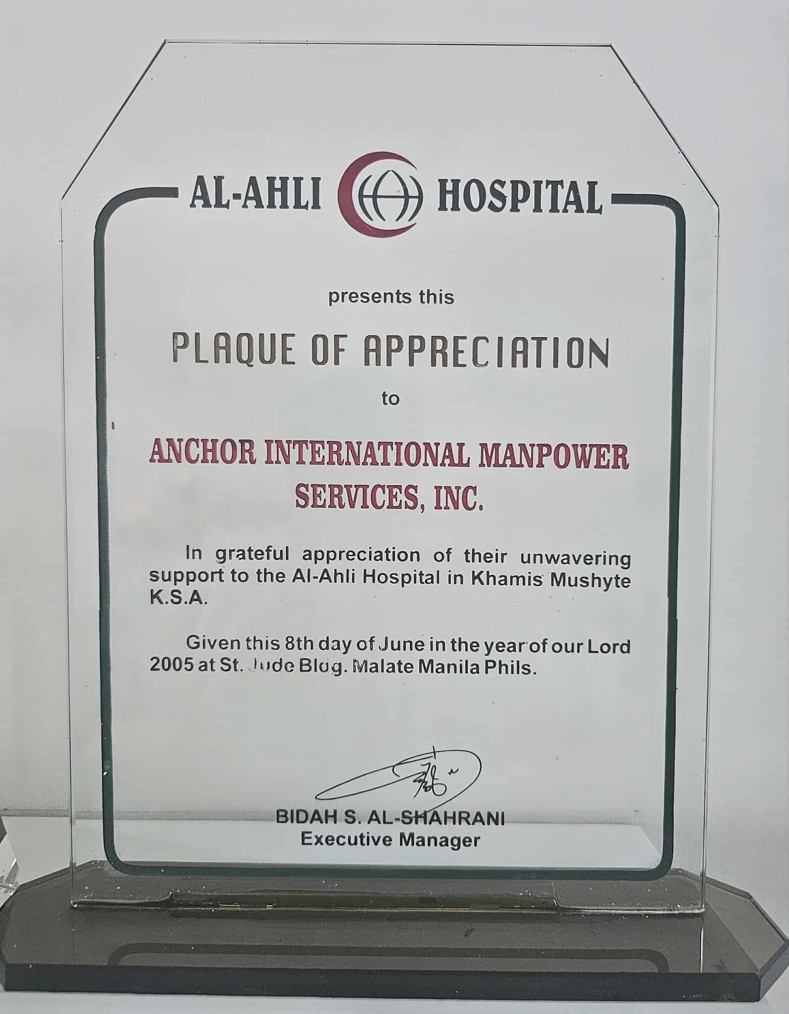 A Legacy of Trust: Celebrating Our 2005 Plaque of Appreciation from Al-Ahli Hospital, KSA